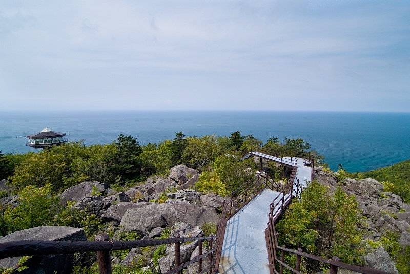 大きく割れた岩石の上を金属製の階段通路を設けてある。こいつを登って展望台に向かった...