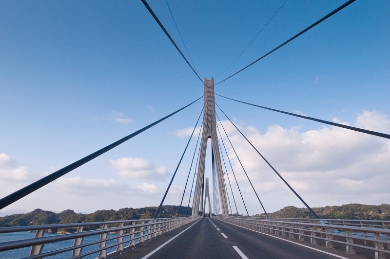 鷹島肥前大橋は佐賀県唐津市肥前町と長崎県松浦市鷹島町の間の日比水道をまたぐ橋長1,251mの斜張橋。2本の主塔から、72本のケーブルが伸びている立派な橋だ。