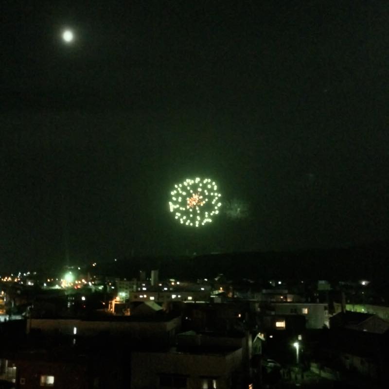 台風11号が迫ってきていますが雨は降っておらず、この日は市の花火大会でした。ホテルの部屋から見ていました。