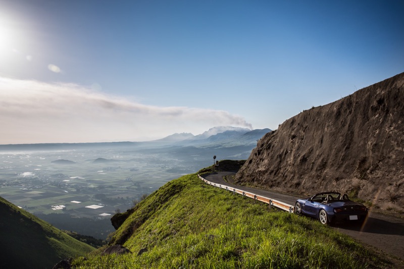 くじゅう連山を駆け上がるワインディングの展望ポイントで阿蘇を振り返ります。