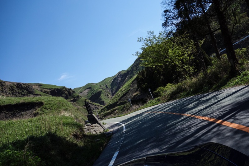 外輪山に沿って降りていきます。もともとは外輪山上の牧草地と狩尾地区を行き来する農道ですのでそれほど頑丈に作られた道路ではなく過去にも路肩崩壊で何度も通行止めになっています。阿蘇の外輪山を登る道は国道や県道でも何度も崩れています。