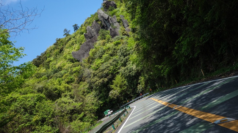 県道28号はすごく好きな道です。渓流沿いのいい道です。木々の緑が美しい。軍艦岩付近です。