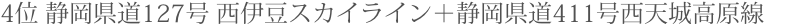 西伊豆スカイラインは伊豆の戸田峠から土肥峠(船原峠)までの約10.8Kmの西伊豆の山の稜線(標高800m)を走る道。そしてその西伊豆スカイライン をそのまま延長したように風早峠まで続く道が静岡県道411号西天城高原線(8.1Km)である。1999年に仁科峠の天城牧場で第50回全国植樹祭が行 われたときに作られたことから、地元では天皇道路と呼ばれている。